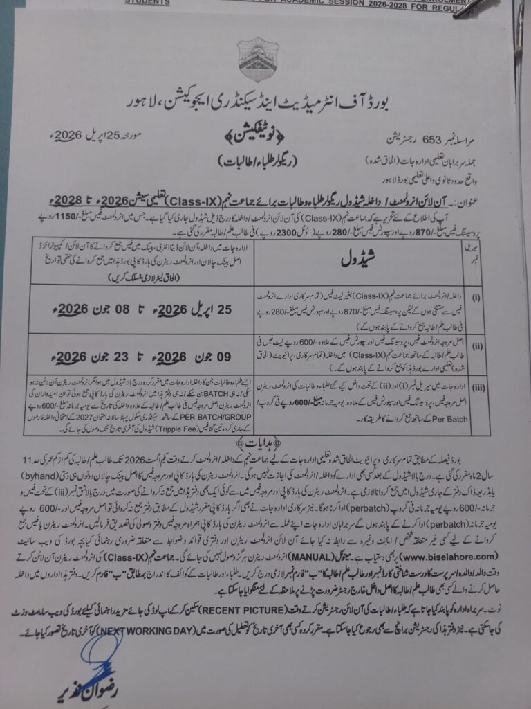 Every year, thousands of students across Lahore, Kasur, Sheikhupura, Okara, and Nankana Sahib face one critical window of opportunity: the Class 9 (SSC Part-I) enrollment through the Board of Intermediate and Secondary Education (BISE) Lahore. For the academic session 2026–2028, BISE Lahore has officially issued Notification No. 653 (Registration), dated 25 April 2026, outlining the complete online and manual enrollment schedule for regular students. Miss the deadline, and you pay triple the fee. Act now — and secure your seat stress-free.