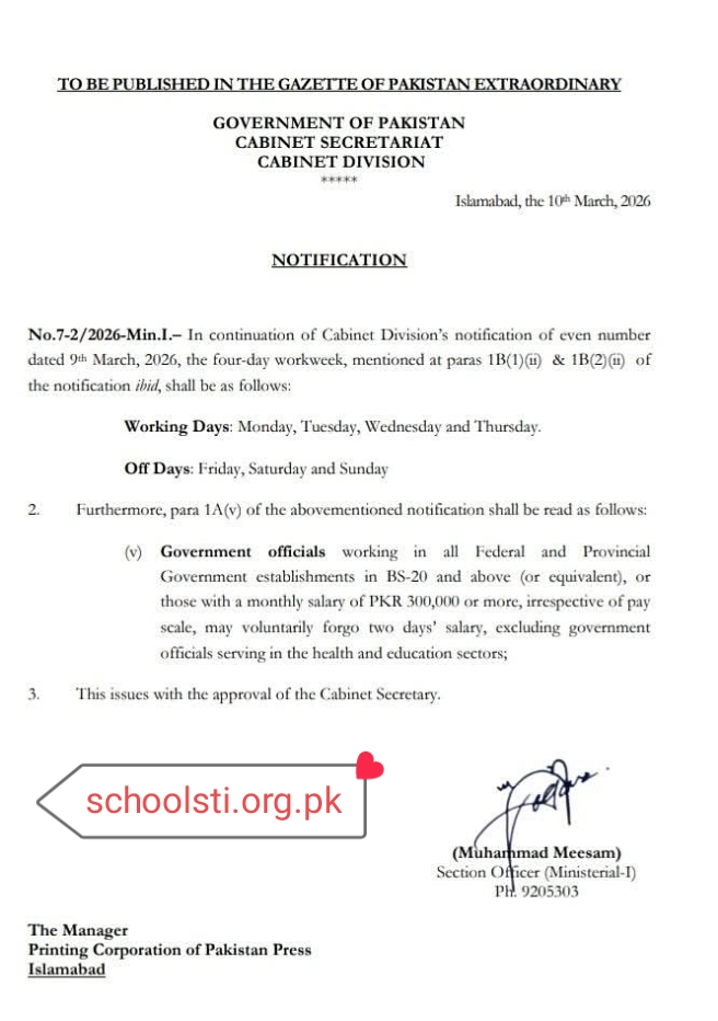 یہ نوٹیفیکیشن کابینہ سیکرٹری کی منظوری سے جاری کیا گیا ہے اور فوری طور پر نافذ العمل ہوگا۔
