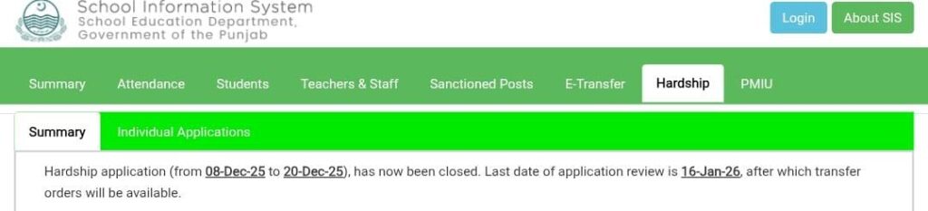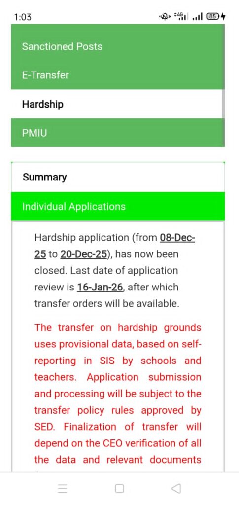 – *ہارڈشپ ٹرانسفر کی درخواستیں* 8 دسمبر 2025 سے 20 دسمبر 2025 تک دی گئیں تھیں ۔- درخواستوں کا *جائزہ لینے کی آخری تاریخ 16 جنوری 2026 کردی گئی ہے*- اس تاریخ کے بعد *ٹرانسفر آرڈرز جاری کیے جائیں گے*۔یعنی 16 جنوری کے بعد ہی آپ کو یہ پتا چلے گا کہ آپ کی درخواست منظور ہوئی ہے یا نہیں۔