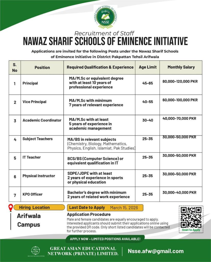 📢 𝐈𝐦𝐦𝐞𝐝𝐢𝐚𝐭𝐞 𝐇𝐢𝐫𝐢𝐧𝐠 𝐟𝐨𝐫 𝐌𝐮𝐥𝐭𝐢𝐩𝐥𝐞 𝐒𝐜𝐡𝐨𝐨𝐥 𝐏𝐨𝐬𝐢𝐭𝐢𝐨𝐧𝐬 𝐢𝐧 Arifwala aplications are invited for the following Posts under the Nawaz Sharif Schools of Eminence Initiative in Tehsil Arifwala