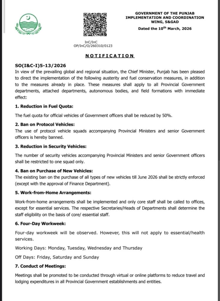 صوبہ پنجاب نے ہفتے میں چار روز اور تین تعطیلات کا نوٹیفکیشن جاری کردیا.