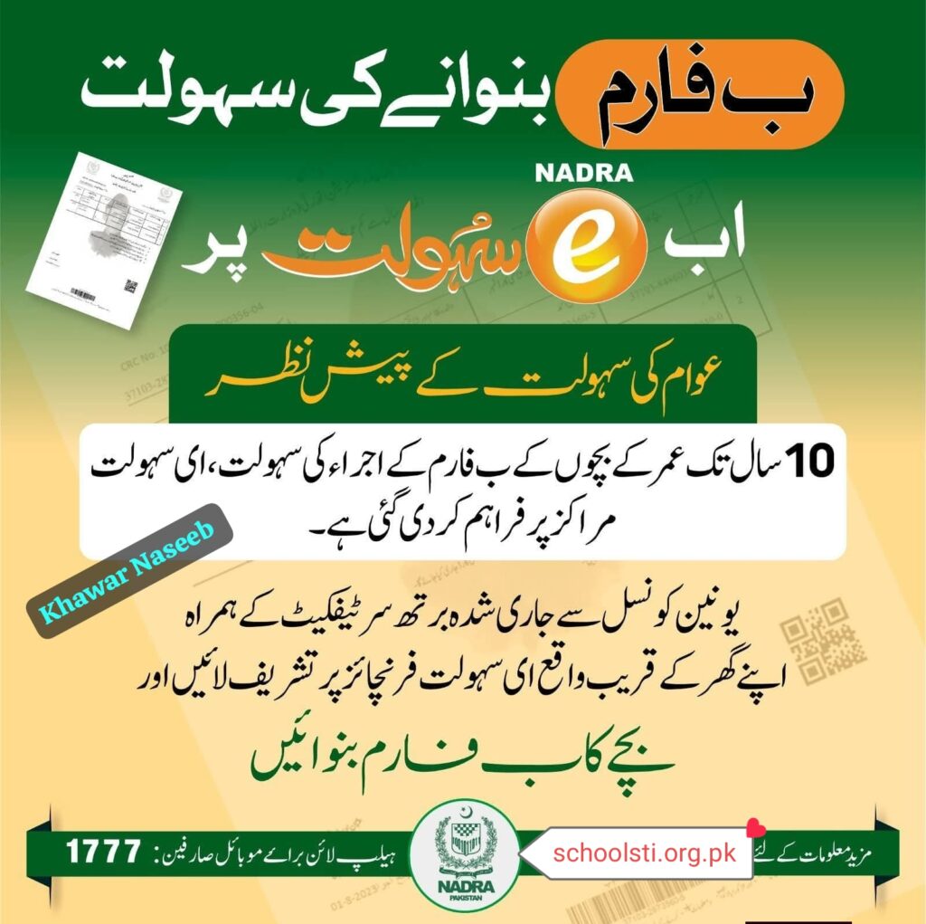 For the convenience of the public, the facility of issuing B form for children up to 10 years of age has been provided at e-Sahulat centers.