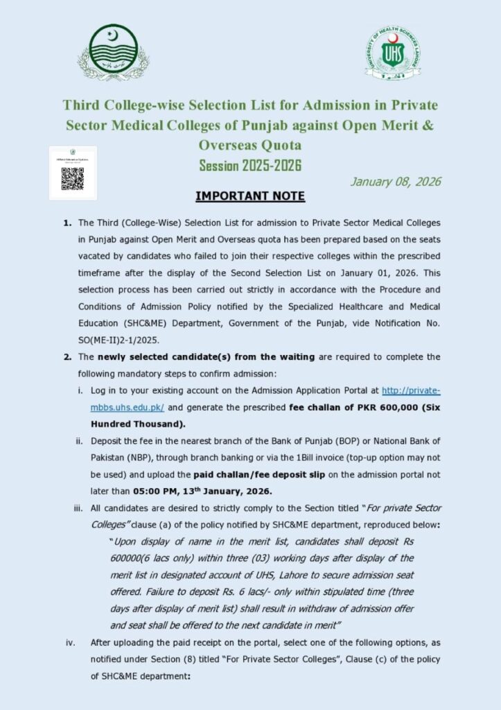 - The Third (College-Wise) Selection List for admission to Private Sector Medical Colleges in Punjab against Open Merit and Overseas quota has been prepared based on the seats vacated by candidates who failed to join their respective colleges within the prescribed timeframe after the display of the Second Selection List on January 01, 2026. This selection process has been carried out strictly in accordance with the Procedure and Conditions of Admission Policy notified by the Specialized Healthcare and Medical Education (SHC&ME) Department, Government of the Punjab, vide Notification No. SO(ME-II)2-1/2025.